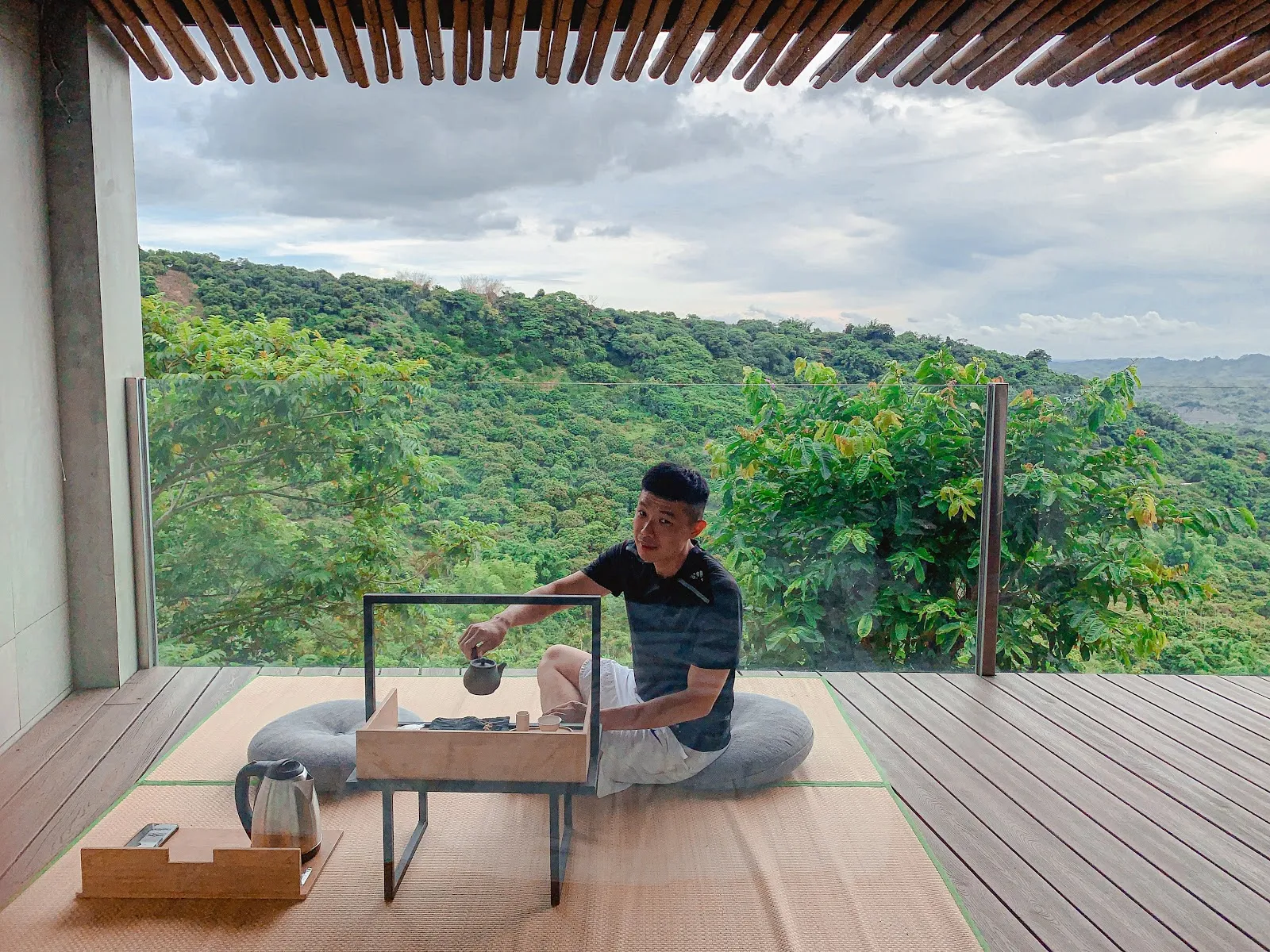 這次入住仙湖農場的『迎山』客房,果然名符其實,一進門就是超大落地窗可以直接眺望遠山,最喜歡的巧思是民宿準備了一組小茶几包含茶具、點心、茶還有草蓆跟椅墊,可以整組拿到陽台,邊品茶邊沐浴在大自然的綠意中,覺得身心都被深深的療癒了。